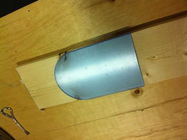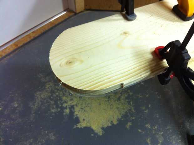 Crear una plantilla. Mina fue hecho en un cortador láser. Un círculo de 5.5" se fusionó con una plaza para hacer una especie de 'ficha' que pude fijar a cada uno de los 1x6s. Si no tienes un cortador del laser (Cuáles son las posibilidades), sospecho que le podría a mano una plantilla de algunos desechos de madera y arena hacia abajo hasta que quede a tu gusto