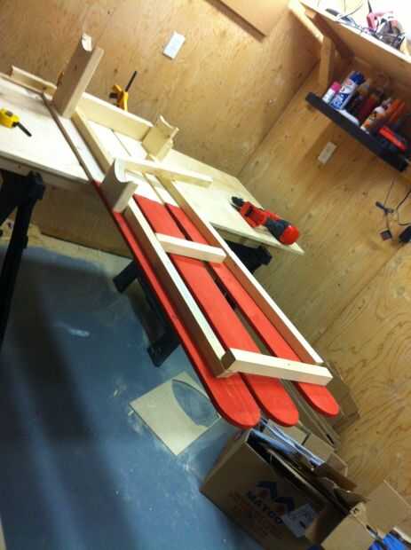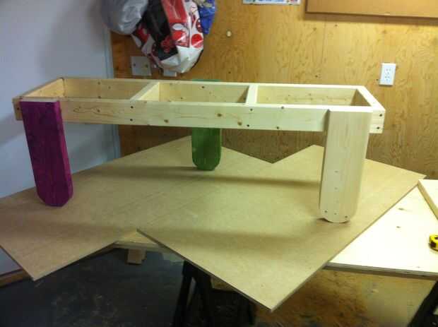 Fue montado en la parte superior algunos MDF que tenía puesta, para tratar de asegurarse de que las patas eran planas. Me puso tres patas, todo al ras con la parte superior de la 2 x 4, luego volcó por lo que se basaba en las piernas y añadido otras piernas (puesto que al ras del suelo, entonces les atornillan en su lugar, así que todo era.