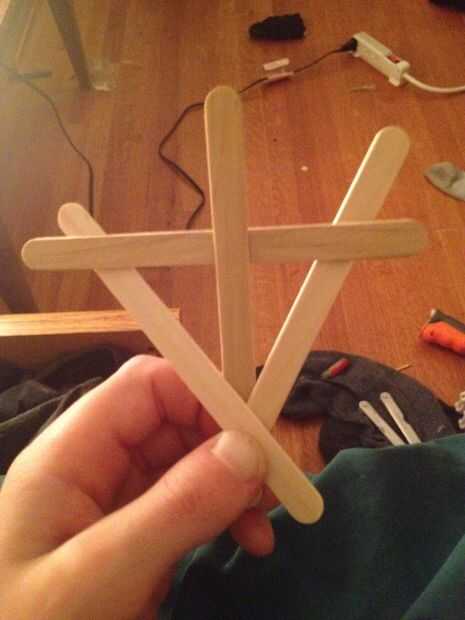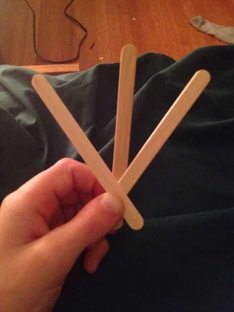 Ahora toma 3 palitos y arreglar como la foto 1 una vez que ellos como ese sandwich una intermedia de palillo Popsicle el 3 por lo que pasa, bajo, en la bodega de la parte inferior firmemente empujarlo entonces toma tu palo quinto y hacer los mismo pero opuesto así que va debajo, encima, debajo y la tensión de las varillas debe mantener juntos