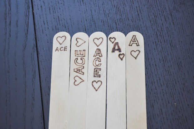 Al decidir el diseño (y la fuente) te sugiero experimentar con "10" como debe tomar la habitación más horizontal de todos los números y "Reina" o "Seven" (si haces palabras). Si vas a hacer algo, como palabras, recuerda que no quieres que pegue arriba si vas a utilizar botes para mantener los palos organizados.