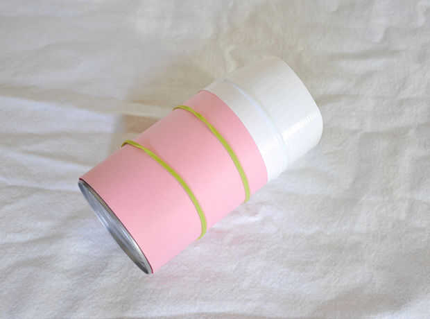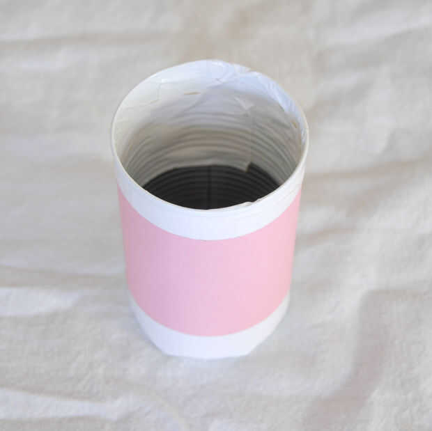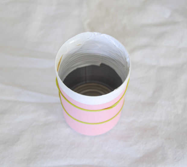 Si usted (o sus hijos) que desee, te sugiero cortar un pedazo de papel que se ajuste envuelto alrededor de su (más un poco de superposición) y decorar las piezas de papel. Una vez que esté listo, con cuidado cinta adhesiva a la lata. Si no quedas bien, use bandas de goma para sostener el papel hasta llegar a la cinta.