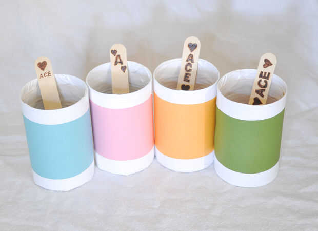 Ciertamente sólo puede jugar con estos palillos como son, pero tener tazas para mantener las cosas organizadas para juegos puede ser útil también. Usted puede usar lo que quieras, pero aquí es cómo decoré mi sopa puede tazas de palo de la baraja.
