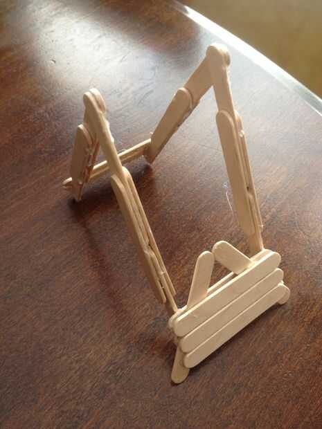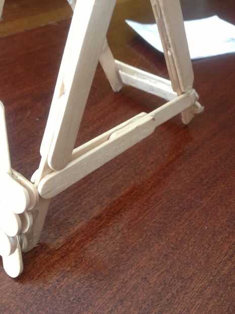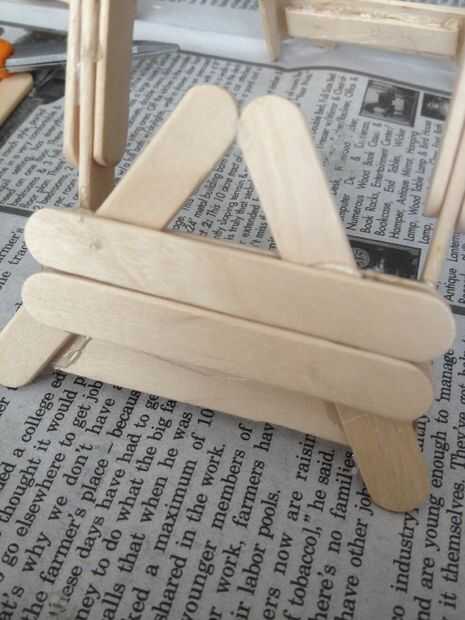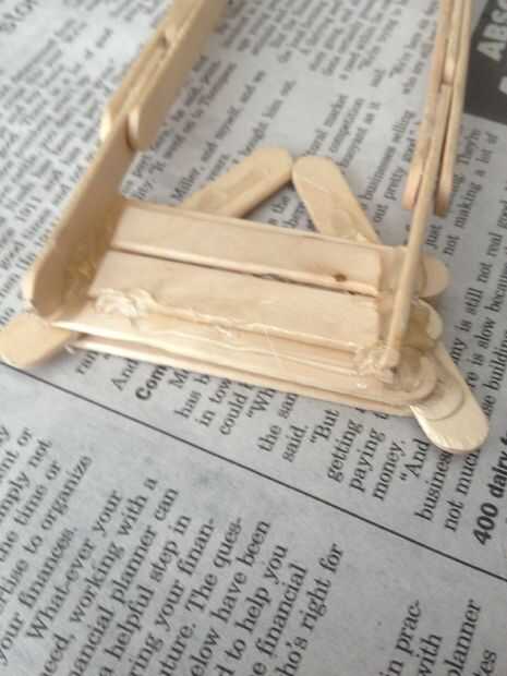 Al hacer la base se pega un palito en la parte delantera y luego añadir más y más hasta que es robusto. A continuación hacer lo mismo con la parte posterior. Por último añadir unos soportes laterales para que sea estructuralmente.