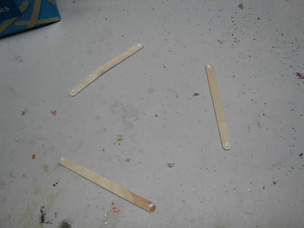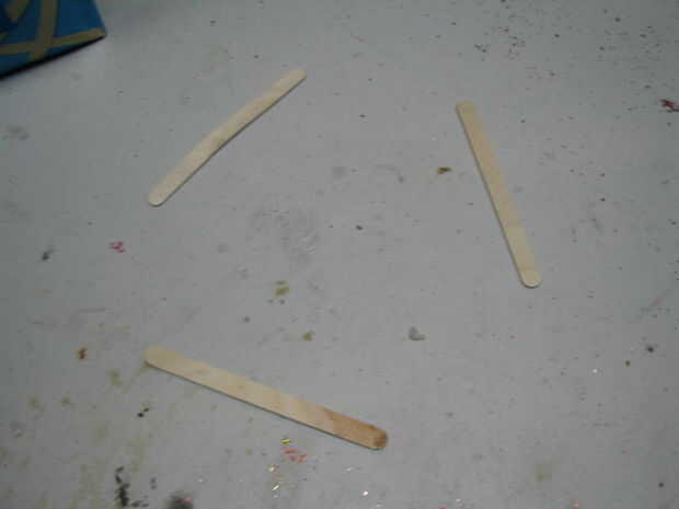 Los que hay demasiado, pone hacia fuera tres palos por lo que parece un hexágono con tres lados que faltan. Cuando termine, poner un punto de pegamento en cada extremo de cada palo.