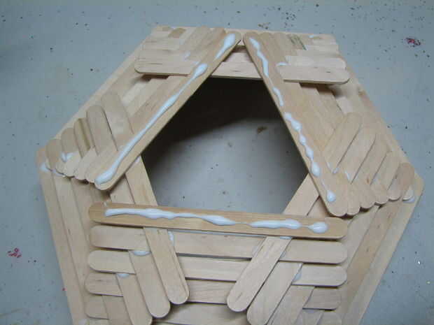 Lo que vas a querer hacer es poner una línea de pegamento completamente a través de los tres palos y cubra el orificio con un montón de ellos.