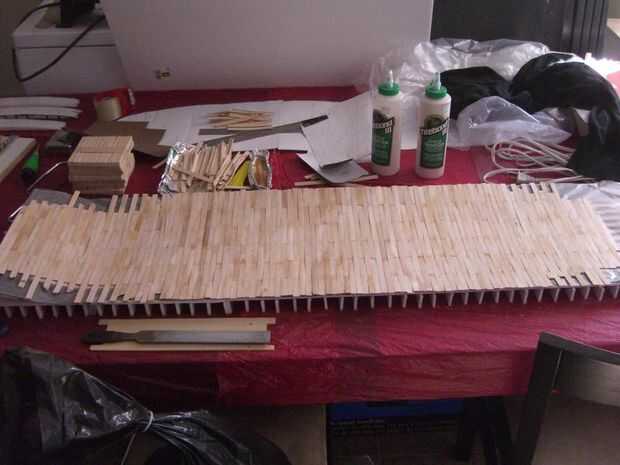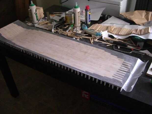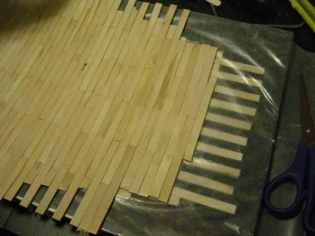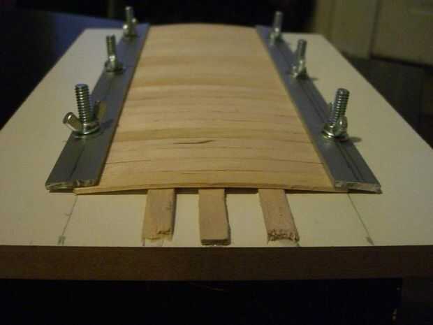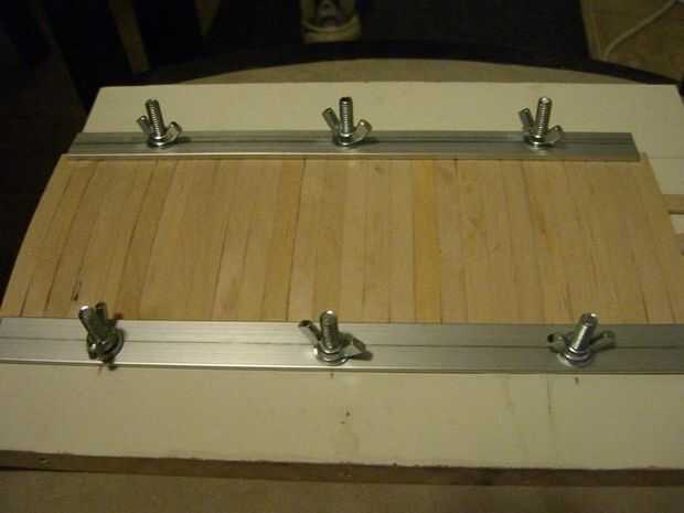Construí una plantilla que podría poner un montón de palos en y vapor al mismo tiempo. Coloqué la plantilla boca abajo encima de una olla grande y cubre algunos de los huecos con un trapo. Cuando cocer al vapor la madera que desee el vapor para mover alrededor de la madera. Una cámara de vapor con unos agujeros en él es bueno. Los palillos sólo necesitan estar expuestos a vapor de 45 segundos a un minuto. Una vez que había enfriado me hizo estallar hacia fuera y agregó otro montón.