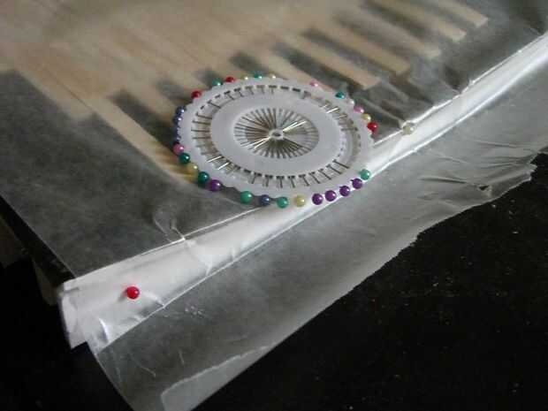Cubrí la primera capa con papel de cera para que la siguiente capa no se pegue a él. Me marcó la línea de centro con un alfiler y comencé a pegar mi segunda capa.