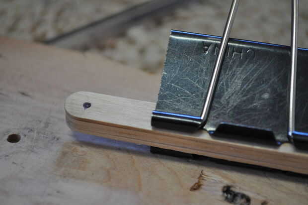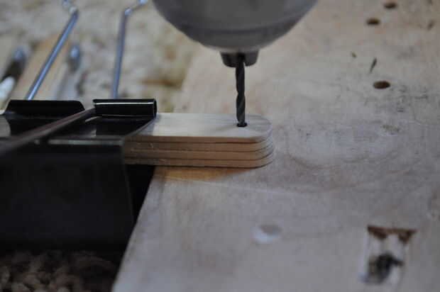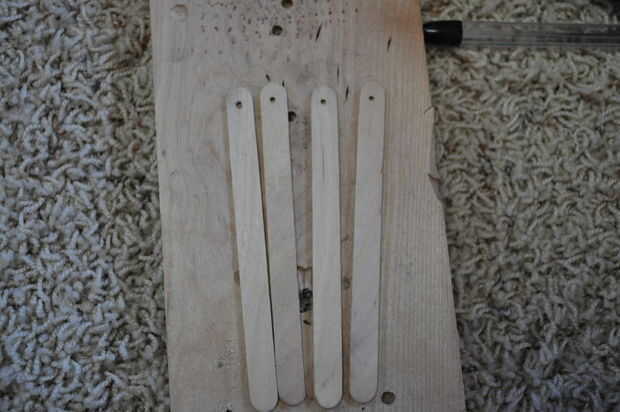 En primer lugar, vamos a hacer el mango. Vamos a empezar tomando cuatro palitos y les afianza con abrazadera juntas y asegurándose de que están todos correctamente alineados entre sí. Tomar un marcador y un Marque aproximadamente 1/2 un centímetro hacia abajo desde la punta del palito. Cuidadosamente perforar los cuatro palos en que marca con una broca un poquito más pequeño que el diámetro del clavo que elija usar. Ahora deberíamos tener cuatro palos con agujeros en la parte superior.