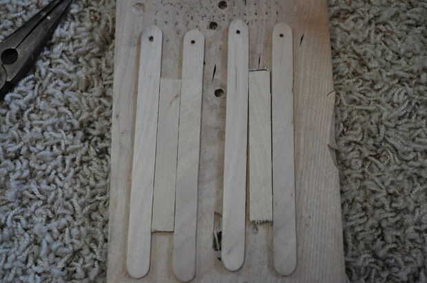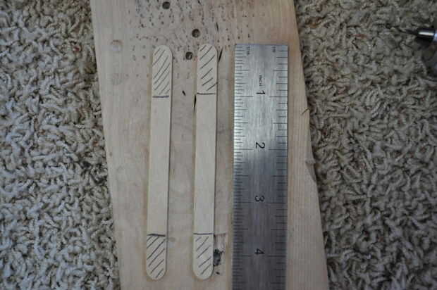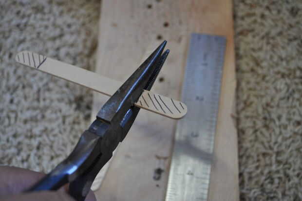 Ahora para la segunda parte de la creación de la manija! Tomar dos palitos y cortar aproximadamente 1 pulgada a ambos lados del palo. Usé pinzas para hacer este paso, pero una sierra se puede utilizar si lo desea.