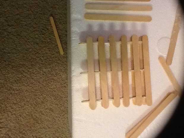 esto es fácil de construir y sólo utiliza 5 palitos. Explota cuando golpea el suelo. Un popsicle stick mi descanso pero generalmente no sucede.Paso 1: Esta es la parte fácil Solo mira la imagen.Paso 2: Esto es cuando se pone duro Asegúrese de constan