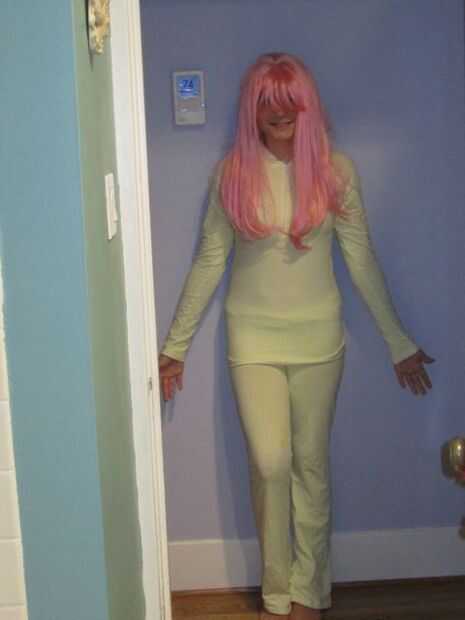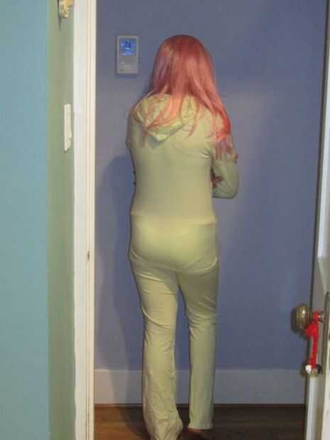 Nos buscaron y encontraron una salida de ropa en línea que vende todo de algodón yoga ropa tipo-ya que no pudimos encontrar la sombra de amarillo lo necesario- y queríamos que el equipo entero del mismo tono de amarillo, optamos por comprar ropa base blanca y tinte en el mismo baño de tinte. Puede o no puede ir a este problema. U obtener sólo los pantalones y la parte superior que son en color. Como hacer artes de fibra-sabía cómo teñir algodón y qué conseguir. Voy a explicar él - pero las direcciones son en todo el internet para hacer esto también. Eligió un top con capucha w/largo de manga y plegarlo sobre pantalones de yoga superior (que bien más tarde trabajó para ocultar la ' faja cinturón "que aguantaba su cola.