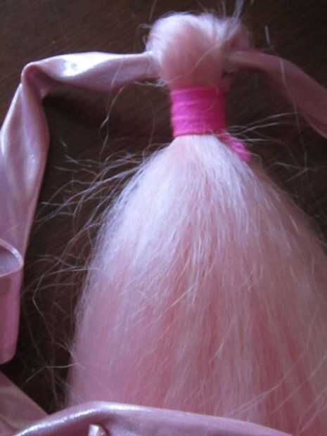Tomar el falso coloreada de pelo el paquete, ya es una 4' longitud del pelo doblado por la mitad, en el pliegue hasta la mitad, me resbalé en una cinta de raso que tenía puesta alrededor de la casa, luego batida la parte superior con hilo para fijarlo libremente, pero cerca al redil de la cinta. De esta manera la cola puede mover o diapositivas (si necesita sentarse) y la cinta puede ser atada alrededor de la cintura y esto vino en práctico cuando necesitaba usar el RR. La cola puede desatada y colgada para arriba y luego volver cuando usted necesita cambiar el fondo o roturas de RR.
