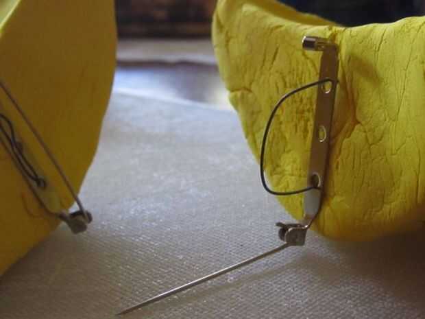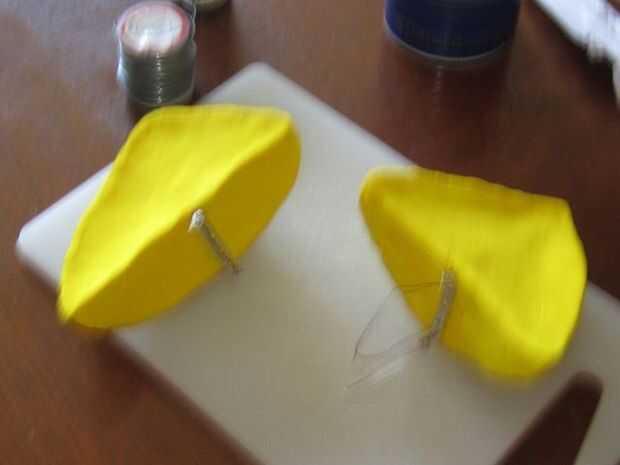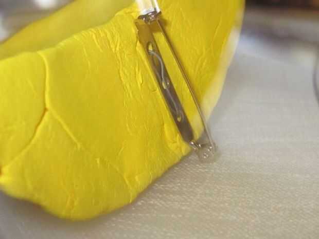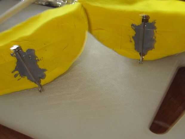 Descubrí que las orejas son espumosas y luz cuando seca, era capaz de empujar un pedazo corto de alambre a través del oído sí mismo. Los pernos de la broche tienen 3 agujeros en la base. Presioné el alambre a través de 2 de los tres agujeros, luego que mezclan el epoxi que tenían en mano. Si el epoxi va a ser visible que habría recibido uno que seca transparente. Yo sabía que esta parte nunca visto - así que no preocuparse que seca gris.