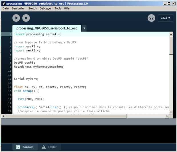 Instalar tratamiento y extracto de: processing_MPU6050_serialport_to_osc.zip