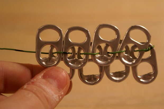 quiera necesidad â ¢ â ¢ conducto cinta â ¢ soda 8 pestañas â ¢ pendiente 2 ganchos de las tijerasPaso 1: Empezar con cuatro lengüetas de Soda y tomar el lado liso sin la muesca y doblar un poco más.Paso 2: Corte uno la izquierda de la cara lisa.Paso