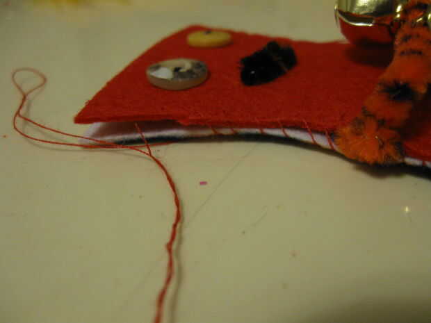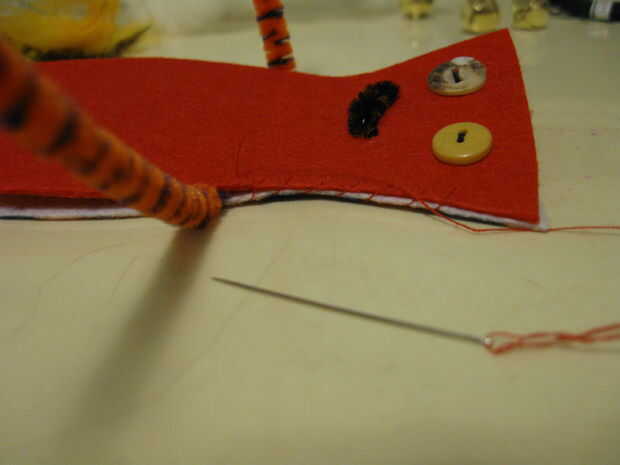 Comenzar en la parte superior de la cabeza y trabajar hacia abajo. Como vas, añadir en el limpiapipas de brazos y piernas si lo desea. He hecho critters con dos, cuatro y seis patas - todo depende de la mirada para que va. Lo importante es añadir la puntada que se sostienen firmemente en lugar por el hilo. También puede Agregar campanas en un limpiador de pipa y convertirla en un bucle como lo hice aquí.