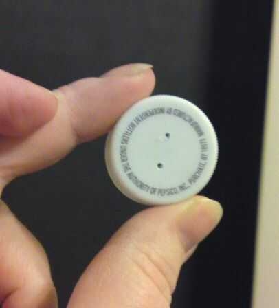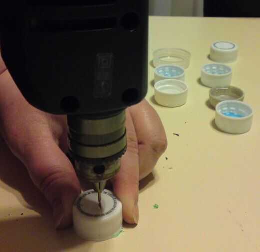 Coloque la tapa, apertura lateral hacia abajo como se muestra en la imagen, en la superficie de trabajo. Perforar hacia abajo, pero no empujar demasiado duro o te azote a través de la plástica e inicie la perforación en la superficie de trabajo. El peso del taladro será probablemente suficiente para hacer el agujero.