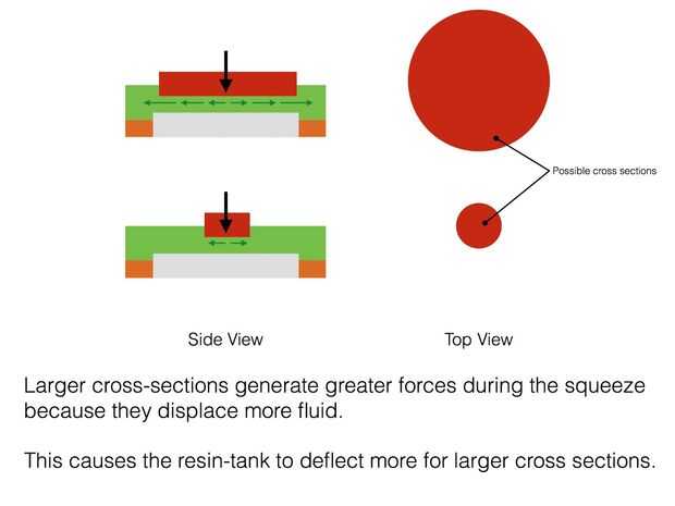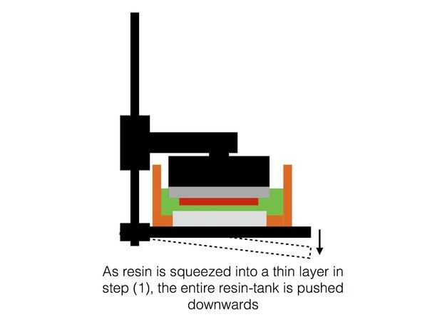 Cada vez que la cabeza de la estructura mueve hacia abajo (paso 1) la resina entre la ventana y la impresión es "exprimido" en una capa extremadamente fina. El espesor de esa capa es, de hecho, el grueso de la capa que ha elegido. El estándar es de 25 micras (0,025 mm), que es sobre el grosor de papel de arroz. La acción de apretamiento para formar una fina capa de resina puede generar fuerzas importantes, causantes del todo tanque de resina mover hacia abajo. Cuanto mayor sea la sección transversal área * de la impresión, más las fuerzas generan durante squeeze y así la más grande la desviación.