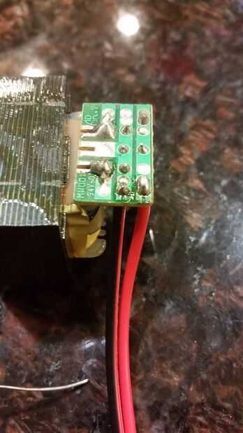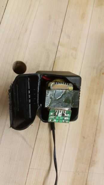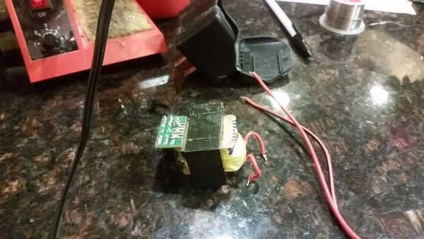 Mi transformador tenía las bobinas estándar, entonces una pequeña PCB con el puente de diodos y un condensador. La polaridad en el condensador le mostrará donde están su V + y V-salidas. La soldadura en un nuevo cable para conectar el jack de 2,1 mm DC barril.