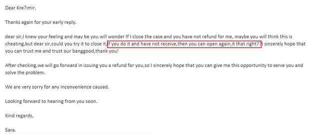 Ese día, intentaron engañarme para cerrar el caso, y después dije que no cerrarla, me manden una imagen de reclamo diciendo que no se reembolsará si el caso no está cerrado (ver imagen).