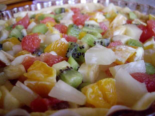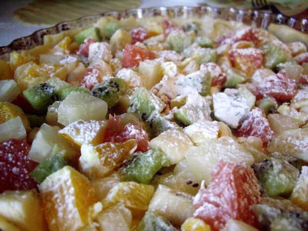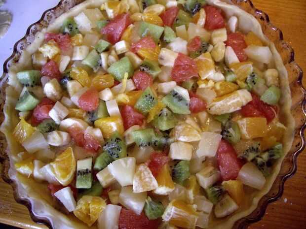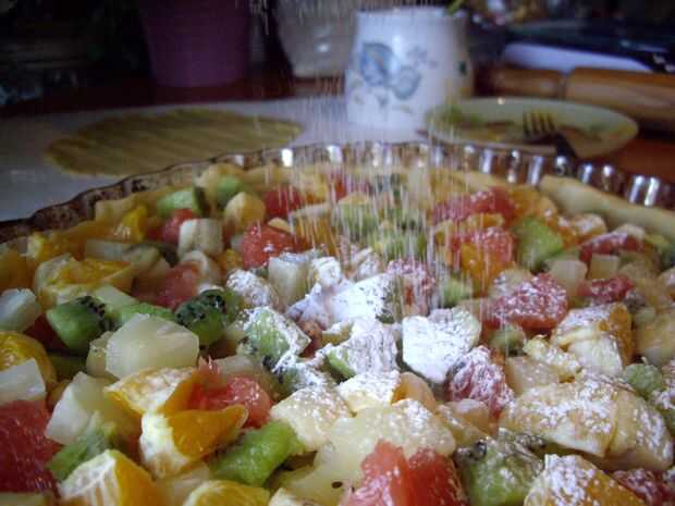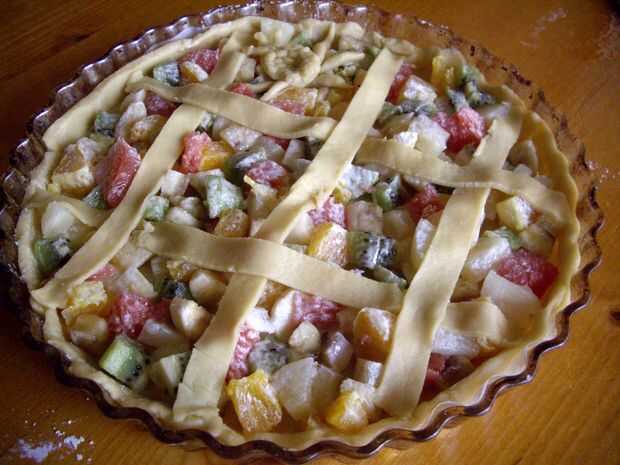 Luego moler la masa (dejando algunas para la guarnición de pastelería) y ponerlo en una bandeja para hornear en una fuente para horno, haciendo que las fronteras. Farina de un poco de polvo sobre la corteza y poner las frutas picadas. Polvo con el azúcar y el resto de farina. Y después de la guarnición de pasta. Hornear hasta que la corteza es marrón de oro. Polvo opcional con azúcar en polvo.
