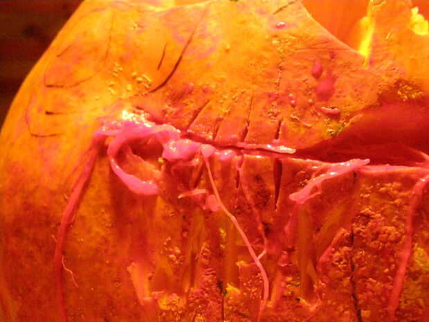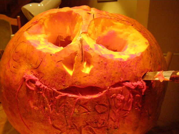 cada año tallar por lo menos una media docena calabazas. Mi esposa tiene acostumbrados unos cuantos así. Recientemente, nosotros hemos estado recibiendo otros amigos y familiares a bordo, les enseña a tallar sus propias calabazas de fantástico aspect
