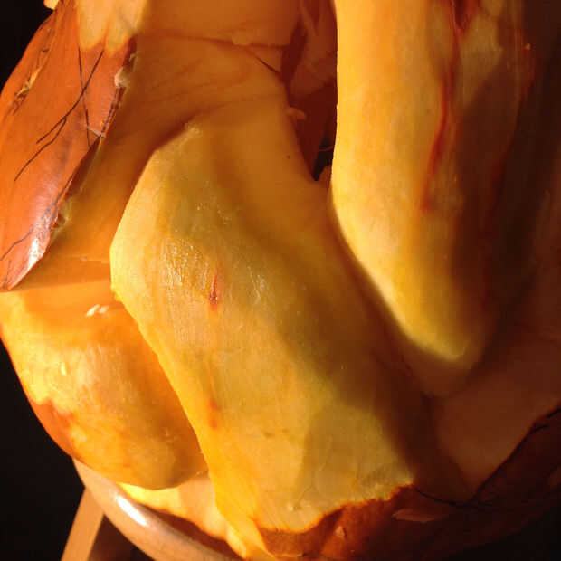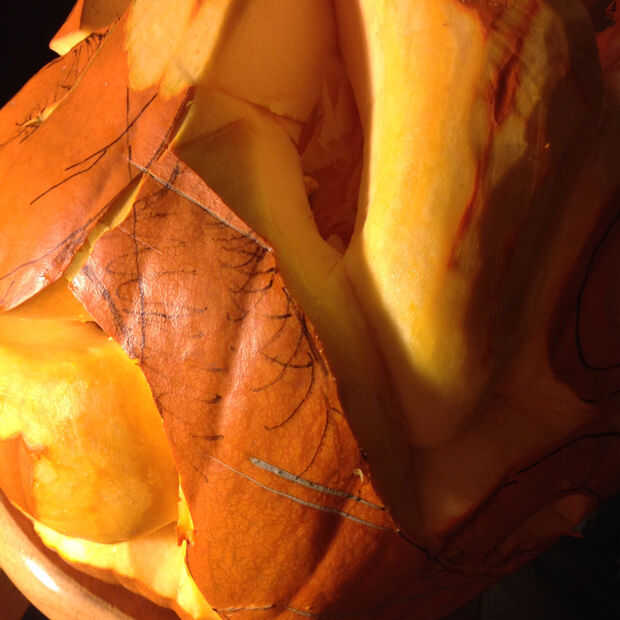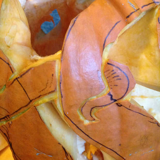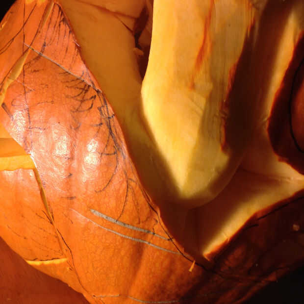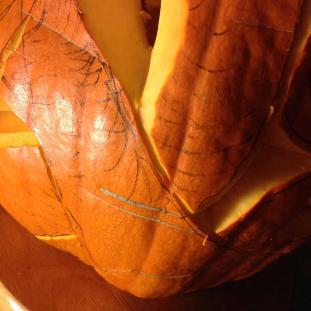 Trazado la línea exterior de cada serpiente utilizando la pequeña talla de madera herramientas, teniendo en cuenta que partes de la serpiente debían ser en frente y cuáles es necesario mirar como si ellos en espiral detrás. El reto es crear suficiente profundidad para las serpientes a retorcerse, limitada por el espesor de la calabaza, que en este caso fue cerca de dos pulgadas.