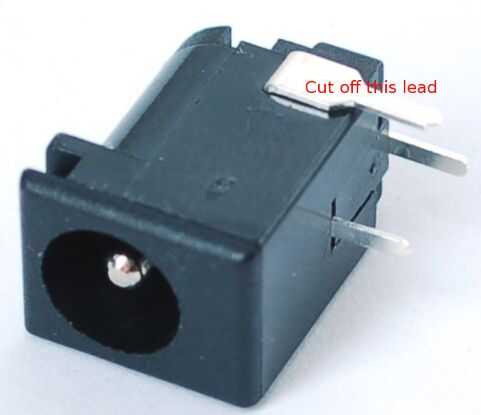 La primera parte de la soldadura es el jack de 2,1 mm barril. A fin de que ajuste es necesario cortar el plomo en el lado de la parte. (ver imagen) Soldar el conector de barril en agujeros a-1 y A-3.