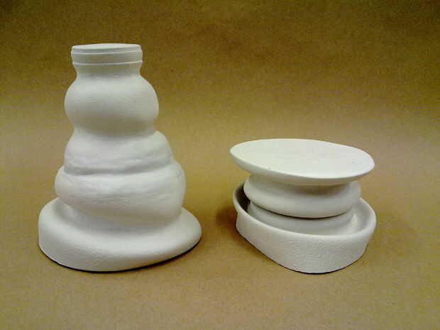 Elegir 2 formas que te gusta y conecta entre sí. Perfore un agujero en cada objeto. Coloque una barra de metal para la fuerza. Conectar los objetos y los bordes se llenan de yeso.