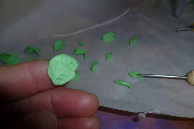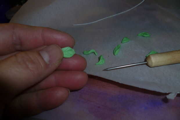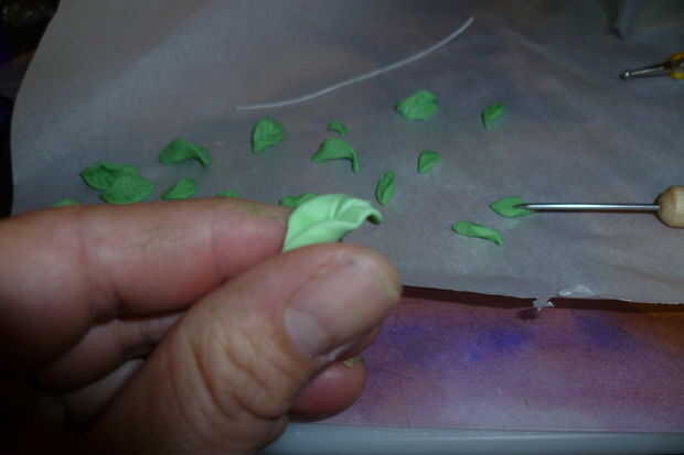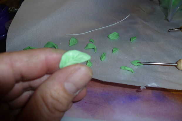 Tener una herramienta de la aguja para crear líneas en las hojas. Doble las hojas para darle alguna forma. Permitir que la arcilla se seque un poco para que la forma y las líneas se conservan. CP es muy suave y fácilmente puede perder su forma.