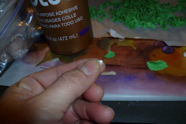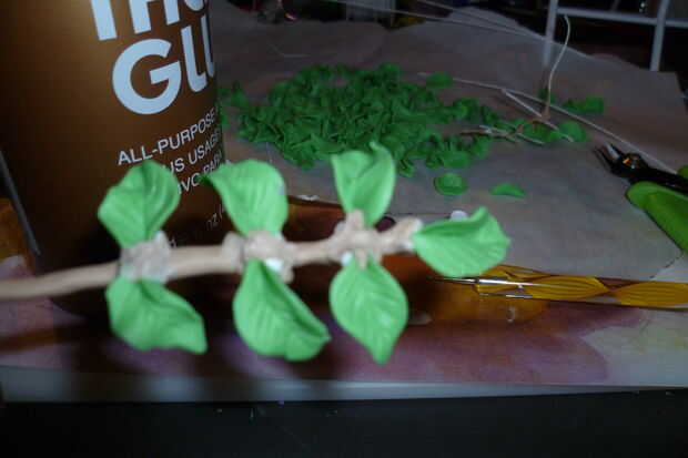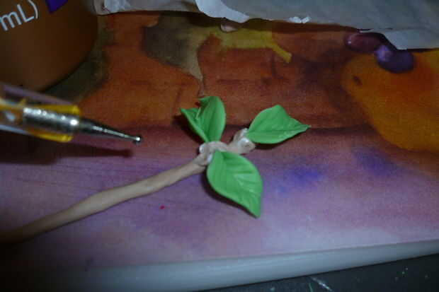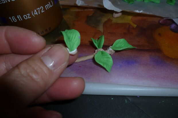 Rollo de pequeños pedazos de arcilla marrón para fijar las hojas a las ramas. Añadir algún pegamento adhesivo a los extremos de las hojas y pegarla en el trozo de arcilla marrón. Coloque la arcilla marrón en el tallo. Doblar el tallo para dar forma a las ramas y dejar para secar.