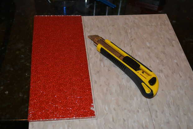 Si no has trabajado con azulejo de piso comercial antes, usted será gratamente sorprendido por lo fácil que es cortar. Todo lo que necesita hacer es puntaje a lo largo de su línea de corte y cierre en medio. Tiendo a usar el borde de mi contador.