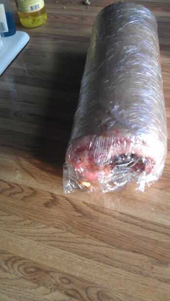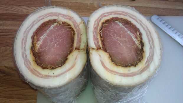 Rollo de panceta alrededor del lomo y luego envolver firmemente con tantas capas de envoltura de plástico necesarias para asegurarse de que no escape en el refrigerador.  Dejar reposar al menos un 1 día.  Cuadro 3 muestra cómo debe buscar una Porchetta firmemente enrollado.