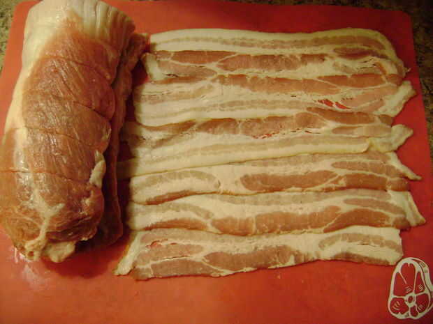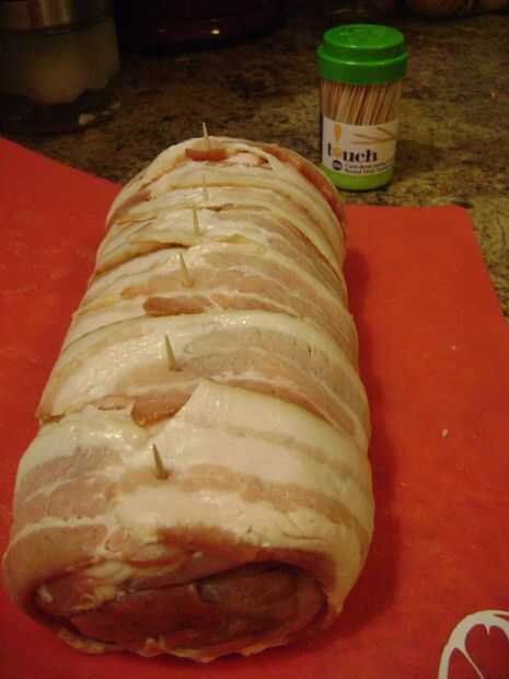 Oh mi Yum! Esto es algo que hacen bastante regularmente. Así de Simple!Paso 1: Prepárese Conseguir un lomo de cerdo (encontré uno que fue previamente marinado en Borbón y jarabe de arce!!! Santa mierda!!!)Colocar varias rodajas de tocino debajo de él