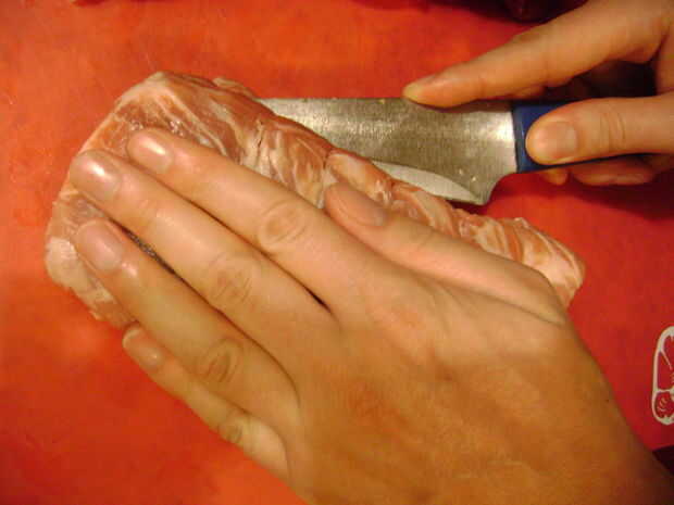 Cortar la cadena de la carnicería de la carne de cerdo. Raja abrir la carne de cerdo pero no cortar a través de todo el camino. Debe poder abrirse como un libro.