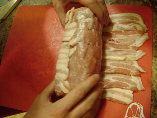 Coloque las rebanadas de tocino la longitud de la carne de cerdo. Cuidadosamente Envuelva la carne en tocino y asegúrelo con palillos.