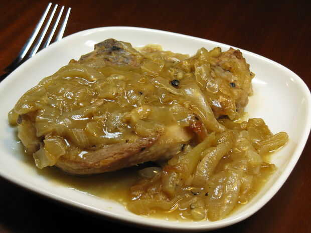 Es una combinación fantástica de carne bastante magra (hueso porkchops), cebolla caramelizada1y una salsa fina. Puede servir sobre el arroz y con un lado de verdes para autenticidad adicional. Recalienta, así que perfecto para las sobras!