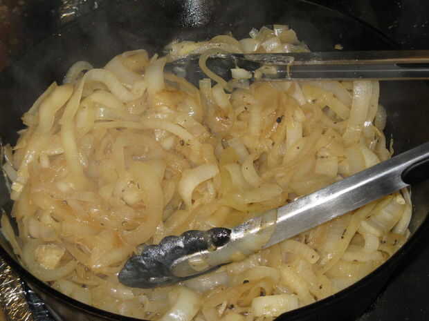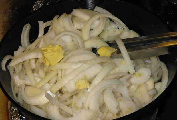 Girar la cacerola para calentar aproximadamente 1/3, agregar un poco más de mantequilla/manteca/aceite a la sartén si es necesario y volcado en las cebollas en puñados. Añadir una pizca de sal para ayudar a ablandar más rápido. Cocinan por muy poco, así que no te preocupes si no los ajuste en la bandeja a la primera van.