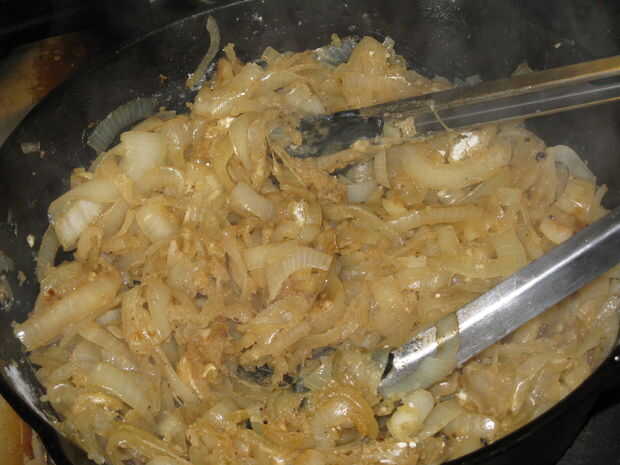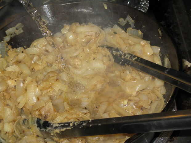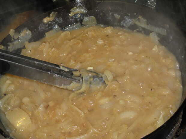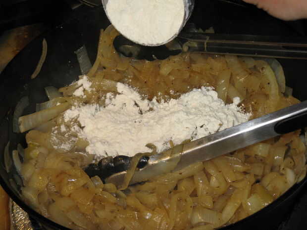 Sacudir la harina uniformemente, revolviendo para mezclar. (Yo he usado 1/3 taza de harina para este volumen de cebollas). Básicamente estás haciendo un roux en la parte superior la mezcla de la cebolla - que desea incorporar la harina en la mantequilla cebolla y dejó suavemente marrón. Baje el calor, si es necesario, para evitar que se pegue y la quema.