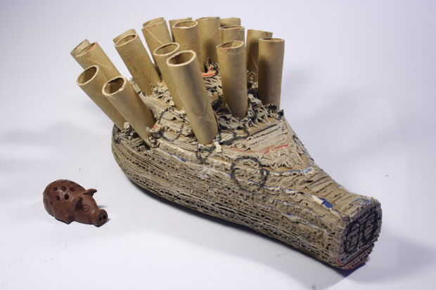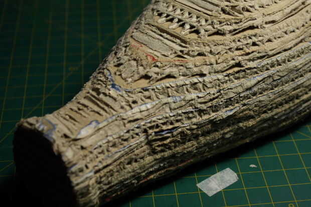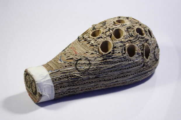 He creado cónico de cartón tubos con cinta de goma natural (como se utilizaría en cajas de embalaje) que esta comprado en la tienda de artesanía local.