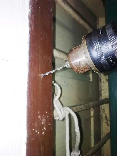 yo diría que esto es el siguiente paso crucial diferente seleccionando el lugar. Necesitamos el carrete de alambre para sentarse allí cómodamente sin deslizarse fuera del soporte. Para lograr esto el agujero debe taladrarse ligeramente en ángulo. Incline el cabezal del taladro ligeramente (unos 5 grados) hacia la tierra y luego taladro. Se tira en el alambre constantemente y el carrete ligero ángulo impide caer hacia abajo.
