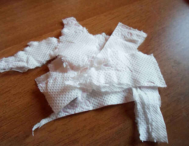 Para hacer esto, ponga algunos pedazos de papel higiénico en la mezcla de pegamento y agua y dejes a absorberla, mezclar todo con los dedos. El papel se convertirá en una papilla que puede moldear fácilmente.