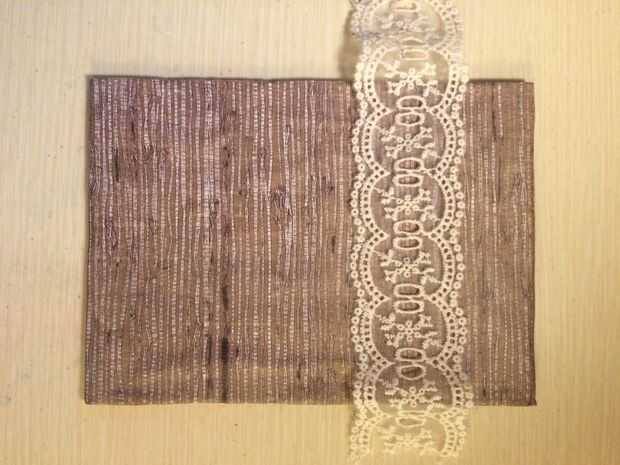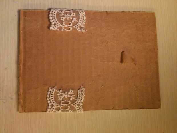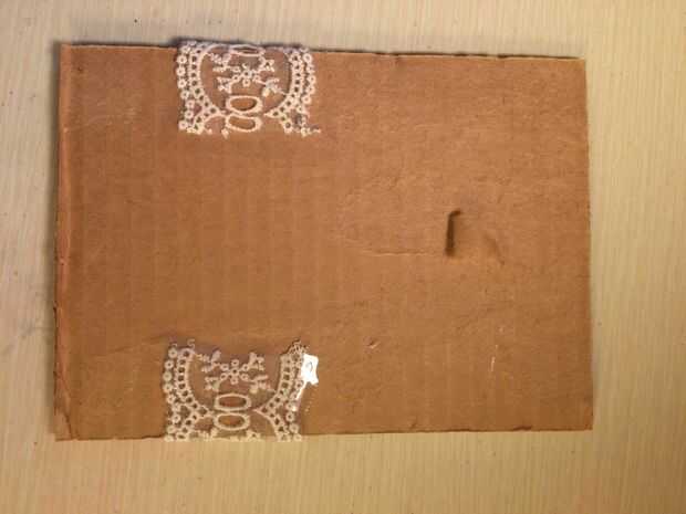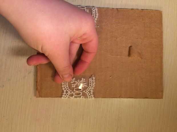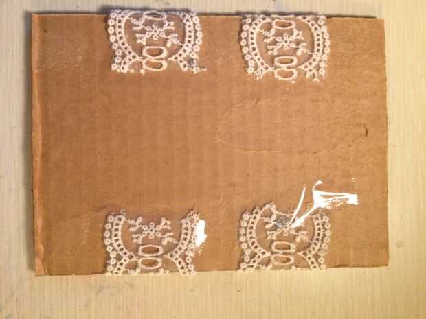 Tome el papel y pegarla a un pedazo de cartón. Luego la cinta hacia abajo las piezas de encaje en la parte posterior de la cartulina.
