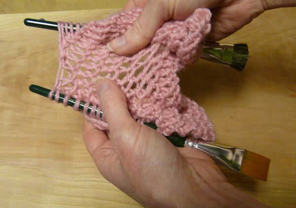 Usar puntadas sueltas. Si tienes grandes agujas de tejer o un gancho de crochet grande, por todos los medios utilice. No tengo ninguna, así que estoy usando las asas de mi dos pinceles más grandes. Los extremos de las manijas del cepillo no muy puntiagudos, pero no importa porque las puntadas son muy flojas.