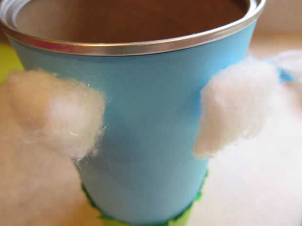 Tiempo por las nubes! Tomé una bola de algodón y rompió en un pequeño pedazo. Tomé un pedazo de cinta y había rodado por lo que sería ser doble cara y pegado a la lata.