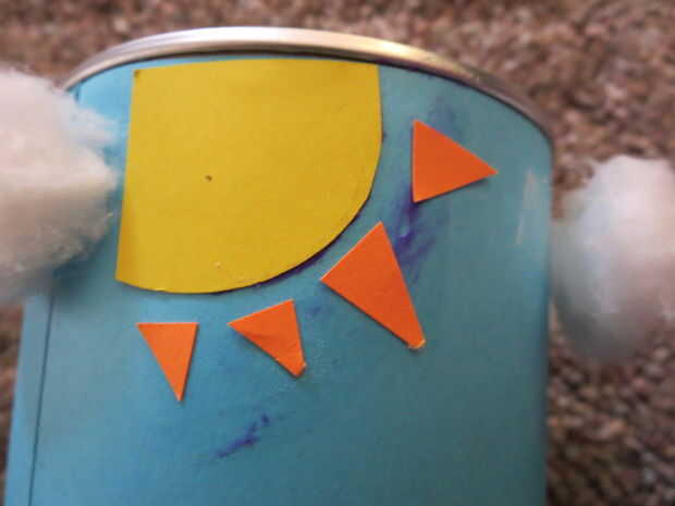 Para hacer el sol, tome un pedazo de papel amarillo y cortar la esquina. Luego simplemente hacer un corte curvo por lo que es una especie de sol de forma. Pegar a la lata. Utilice papel naranja para cortar pequeño piquete y pegue al lado del sol, por lo que se ve como rayos del sol.