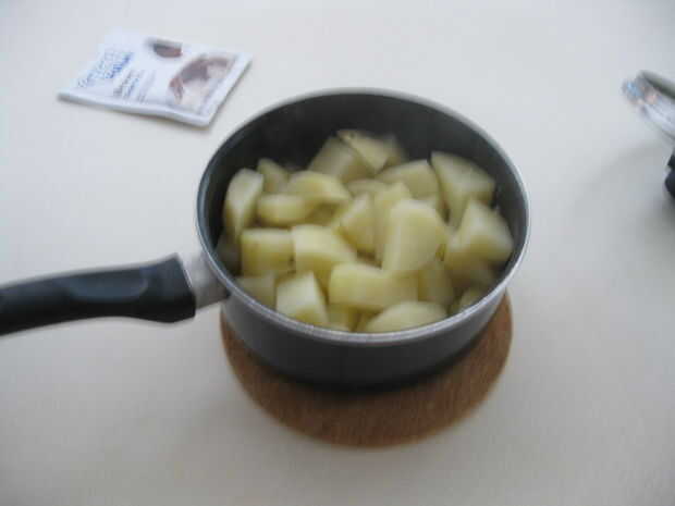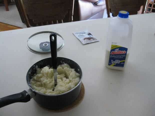 Recordar esas patatas? Este es el momento perfecto para empezar a toquetear otra vez. Si son horquilla blanda, lo que significa en el bote, se puede apuñalar con un tenedor y no encuentro mucha resistencia, seguir adelante y tomar el calor. Drenar el agua y luego puré de las patatas. Una vez que estén quebrados hacia abajo bastante bien añadir un poco de leche. La idea es tener una textura muy cremosa. Si tienes una licuadora darles un zumbido. Tenga en cuenta que nos dirigimos para cremoso, no caldoso, así que Mantén el nivel de humedad abajo tanto como sea posible. Añada suficiente leche para sacarlos suave y lisa.