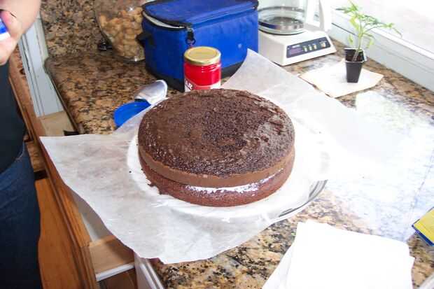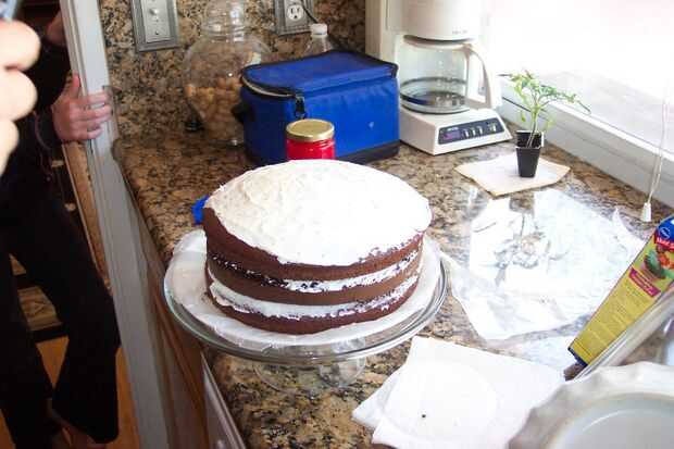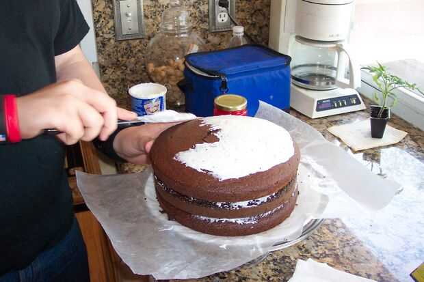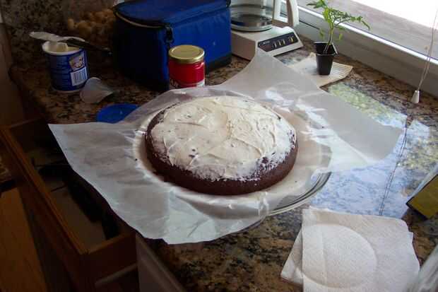Ahora que tienes tu pastel y espero que no en pedazos, ahora es el momento de empezar el baño base, que el chocolate se pegue a. Poner la primera capa en un plato (se puede poner papel encerado debajo de él, si usted está tan inclinado) y poner una capa de betún en la parte superior de la torta. Desea una capa delgada, lo suficiente como para la segunda capa agarrar a. Repito, si fueras tan mala suerte de meterse a su primera hornada de la torta. Ahora, poner una capa media en la parte superior de la torta, junto con a los lados. No tengo mucho de una solución de helar los lados, simplemente fui sobre él con mi cuchillo una y otra vez hasta que ya era todo liso.