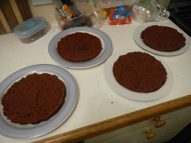 Dejar enfriar por unas horas o toda la noche. Cuando haya enfriado completamente, cortar por la mitad horizontalmente para hacer cuatro capas y espolvorear 125ml de Kirsch sobre ellos.