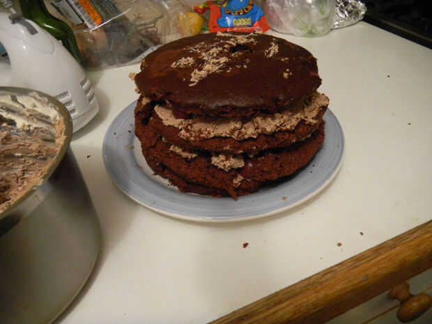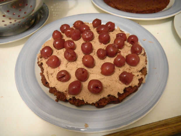 Después de la primera capa tiene realmente difícil mantener intacta toda la cosa y tuve que dejar de tomar fotos así que pude sostener junto con una mano mientras ladelling en esparcir el pegamento con el otro. Probablemente habría ayudado a cortar las cerezas estañadas antes de utilizarlos en el relleno, como las cerezas enteras fueron levantando la torta en el centro y haciéndola hundirse en los bordes.